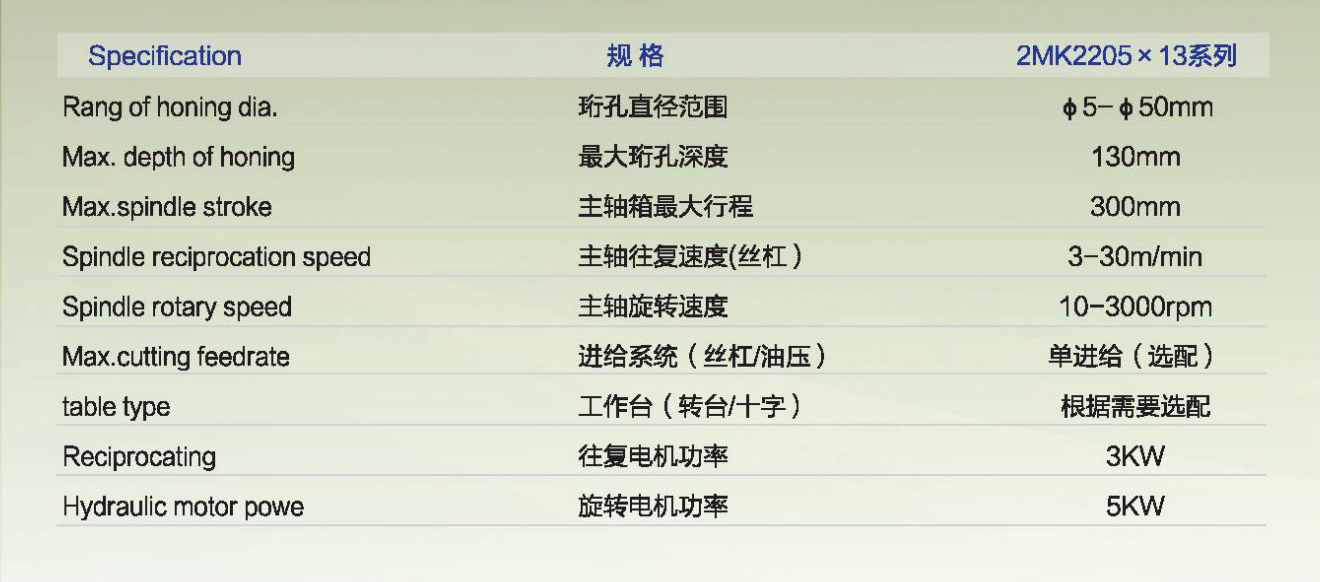 2MK2205X13高速、高精度珩磨機(jī)床是我公司最新開(kāi)發(fā)的小孔珩磨加工的設(shè)備。主軸精度高,珩磨加工后的孔精度高的優(yōu)點(diǎn)。配套我公司珩磨后高精度測(cè)量系統(tǒng),成批加工后孔徑一致性達(dá)到0.003mm,內(nèi)孔圓度0.001mm,圓度0.002mm。本設(shè)備采用模塊化設(shè)計(jì),可進(jìn)行單軸加工,也可進(jìn)行多軸加工。配多軸多工位旋轉(zhuǎn)臺(tái)可對(duì)零件孔進(jìn)行多工序加工,加工后的孔徑尺寸一致性可達(dá)0.003mm。